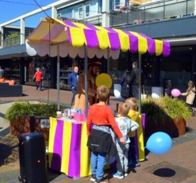 Vanuit een Paas kraam, deelt een Paashaasje de lekkerste Suikerspinnen OF Popcorn uit.