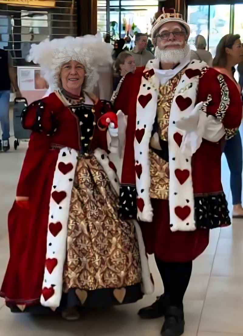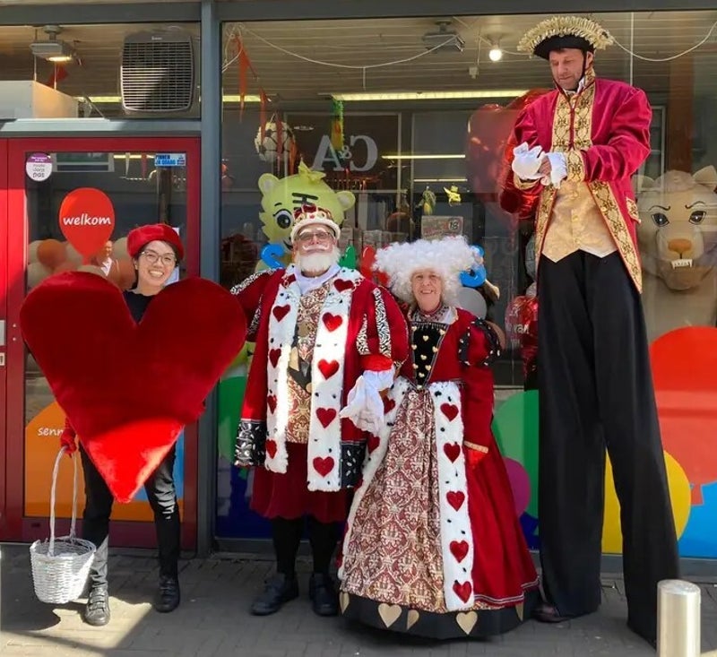 Onze Hartenkoning komt samen met Hartenkoningin, Steltenloper Lakei en ons wandelend Hart.